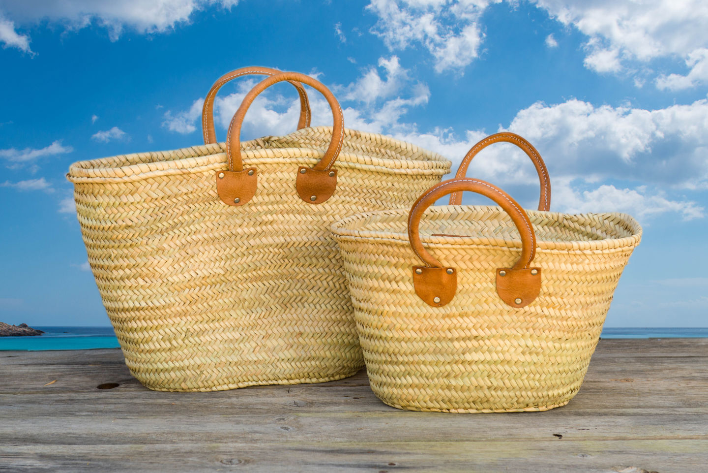 Cesta de palmito con asas de piel de alta calidad. Tres tamaños disponibles.