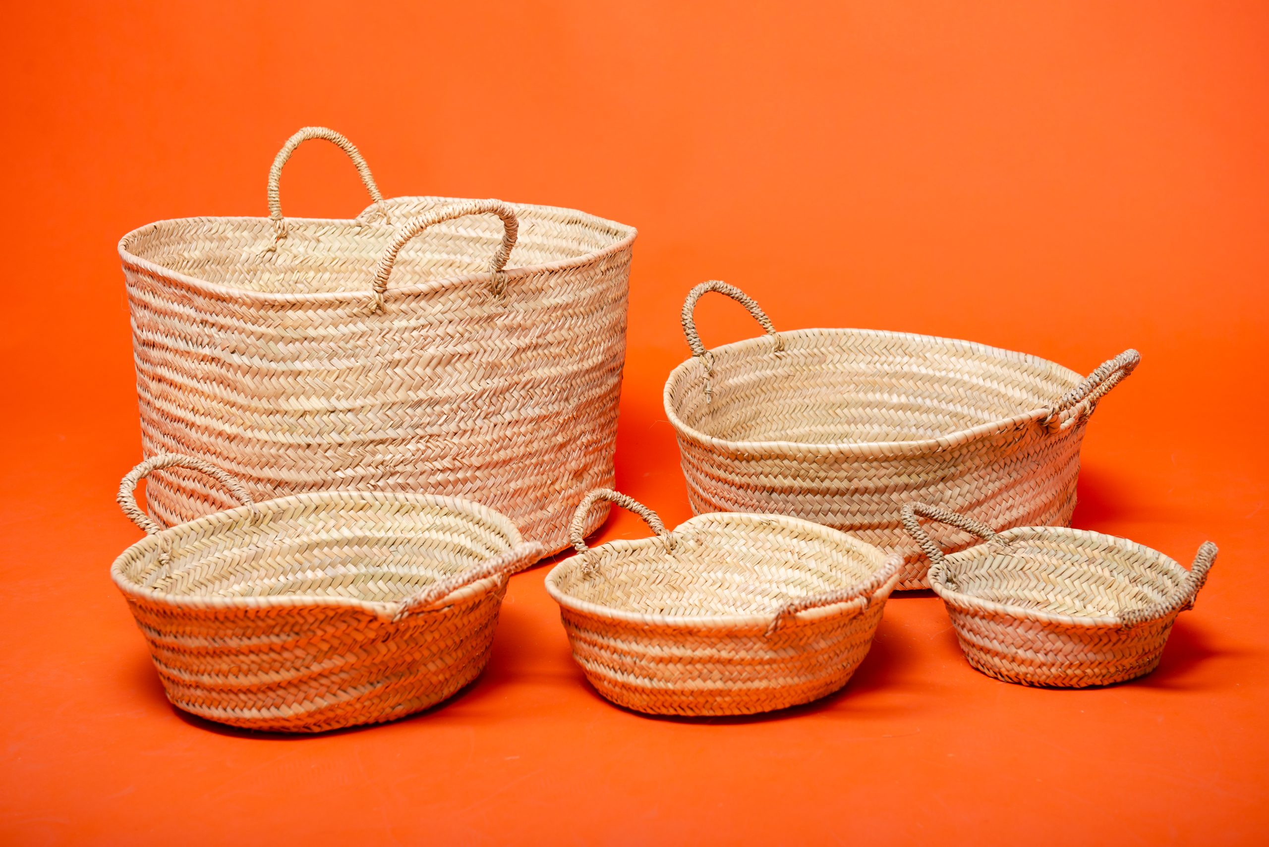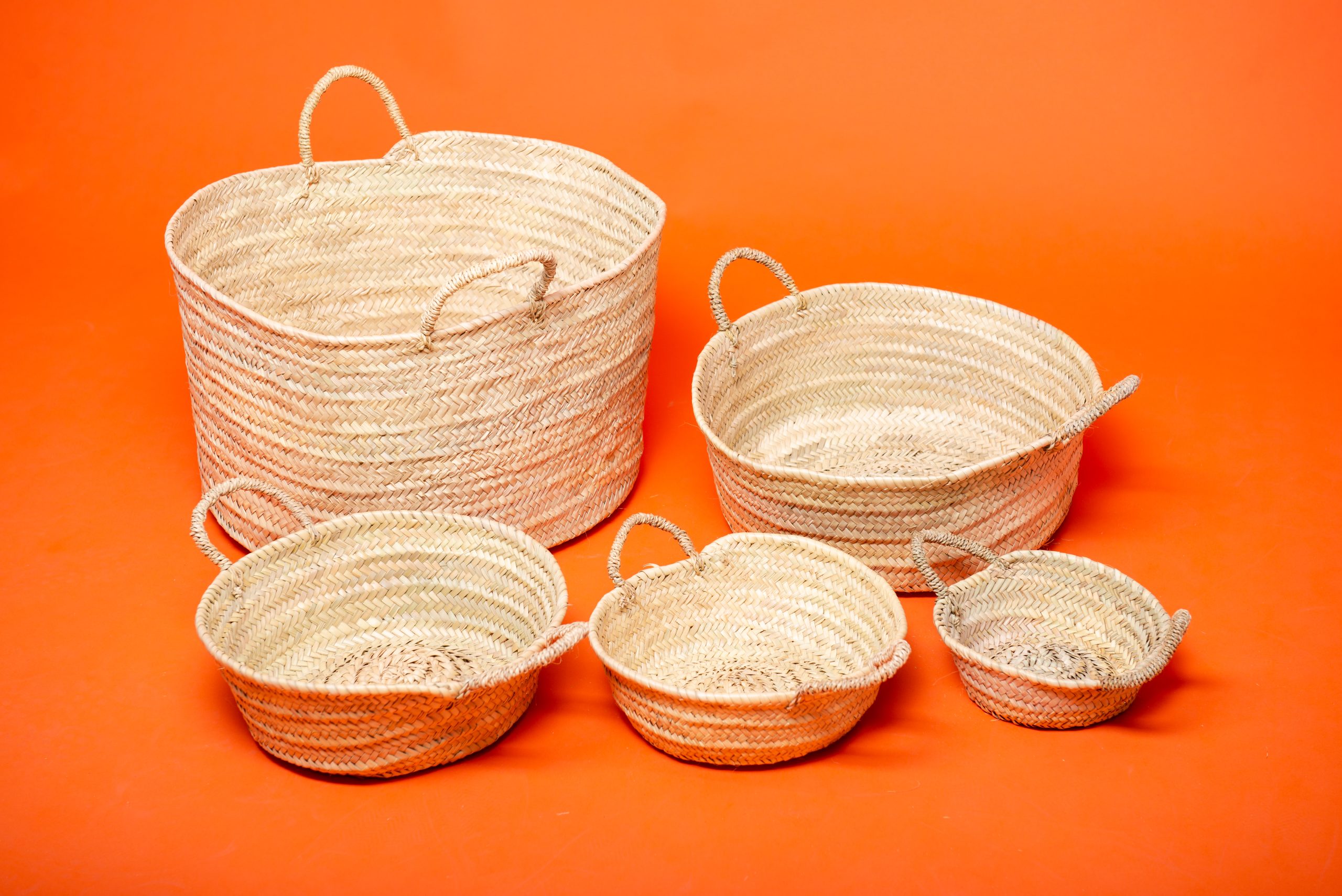 Aquests cistells rodons de palma, trenats a mà, són peces versàtils i funcionals que combinen tradició, practicitat i un disseny senzill. Fabricats amb palma natural, una fibra més lleugera i flexible que el vímet, cada cistell compta amb dues anses laterals que en faciliten la manipulació.