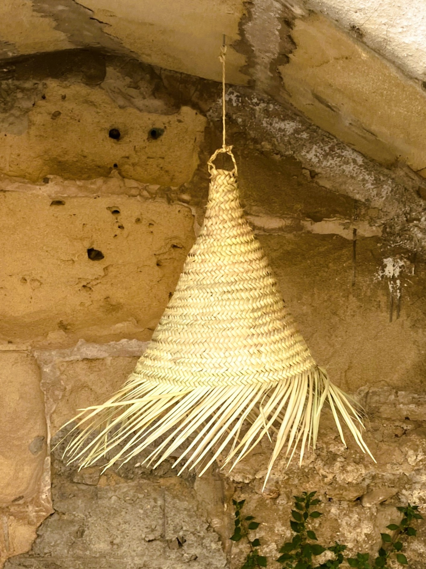 Aquesta làmpara artesanal està elaborada a mà amb palma natural trenada acuradament en forma cònica, cosa que li dona una estructura ferma i un acabat net. A la base, els extrems del trenat es deixen solts per formar uns serrells curts que aporten moviment i un toc natural.