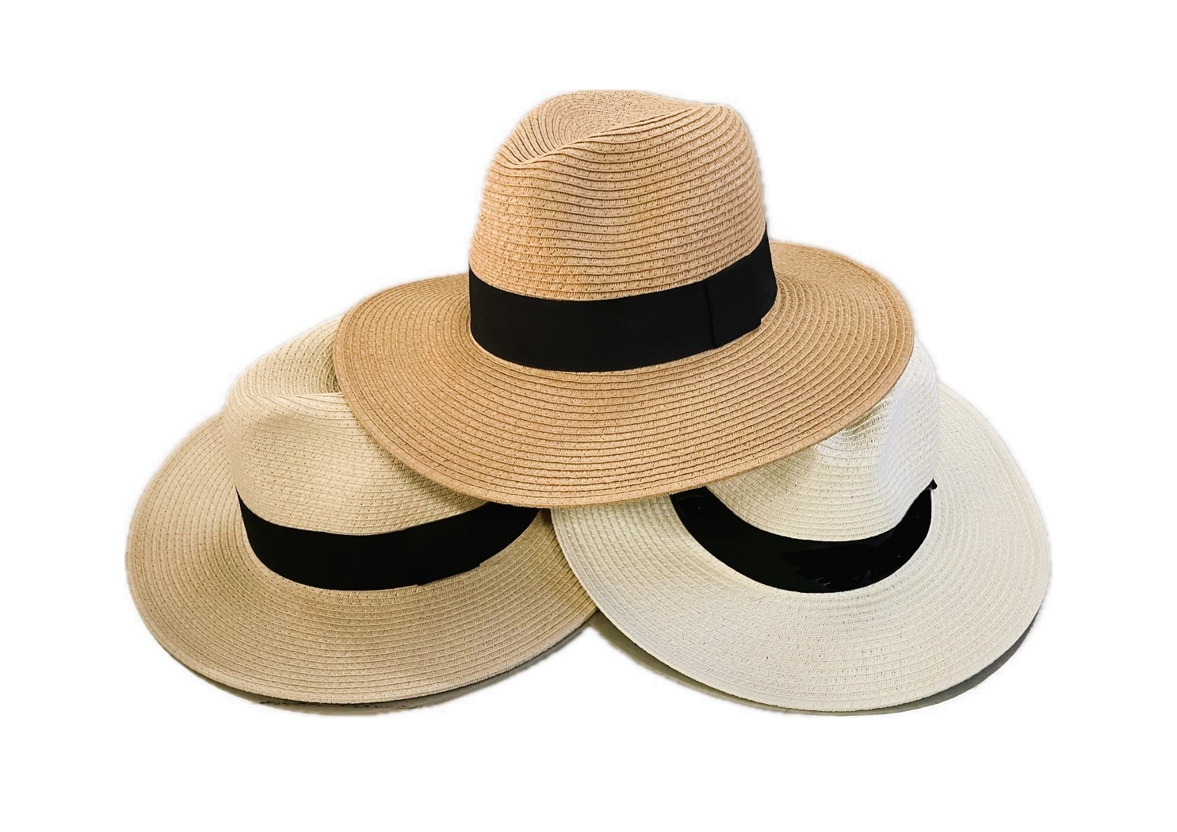 Sombrero americano de trenza de celulosa y cinta de tela negra, disponible en varios colores. Ajustable.